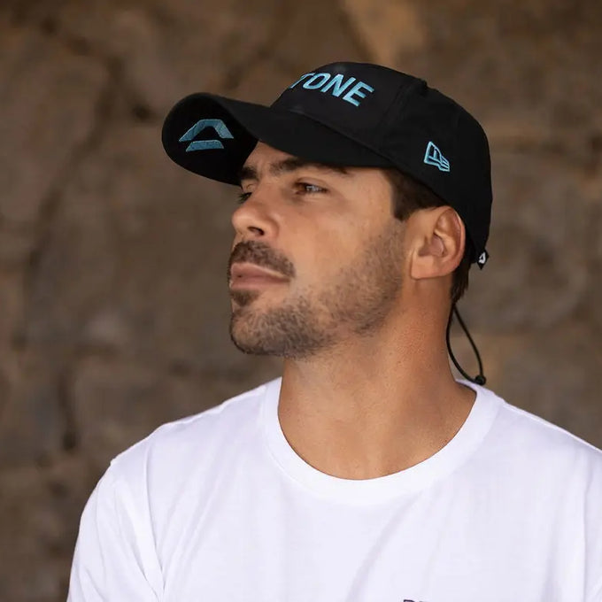 Die klassische New Era Cap kann auf die perfekte Passform eingestellt werden. Kappe in elegantem Schwarz mit blauem Duotone Schriftzug. Stylisch und praktisch.