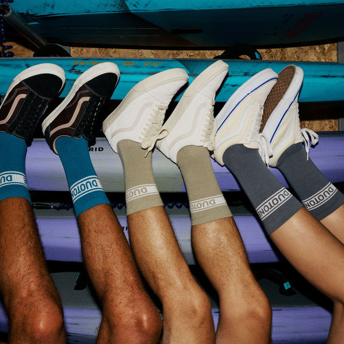 Leicht, cool und bequem, unsere Socks Light Duotone Originals Unisex sind dein perfekter Begleiter für jeden Tag. Mit eingestricktem Duotone-Schriftzug, Icon-Detail an der Seite und Branding auf der Sohle. Der gerippte Abschluss sorgt für guten Halt, das weiche, atmungsaktive Material besteht aus Bio-Baumwolle und recycelten Fasern. Erhältlich in Ink Blue, Metal Grey und Dusty Forest.