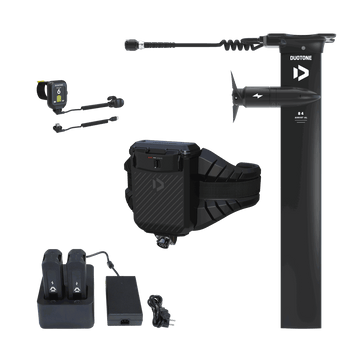 Die Energie für den Foil Assist kommt von zwei kompakten Batterien, die in einer wasserdichten Box an einem leichten eTrapez (ca. 3,76 kg) untergebracht sind. So bleibt dein Board frei von zusätzlichem Gewicht und Widerstand. Durch die Platzierung der Batterien auf deiner Hüfte bleibt das natürliche, flowige Foil-Gefühl erhalten, während du immer noch volle Bewegungsfreiheit hast. Das eTrapez ist auftriebsfähig und leicht abnehmbar. Ein Kabel verläuft sauber entlang der kürzeren Board-Leash und verbindet die Batterien mit dem eMast. Der in der Batteriebox integrierte Empfänger sorgt während deiner gesamten Session für eine stabile und zuverlässige Verbindung zwischen Fernbedienung und Motor.