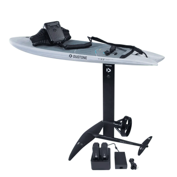 Im Paket enthalten sind Adapter und Fuselage-Verbindung, Schrauben und Tools, Kabel und Leash, Ersatzpropellerblätter, Propeller-Guard, sowie das komplette elektrische Set: zwei Batterien inklusive Tasche, Battery Charger, eHarness und eRemote Watch-Ring. Das Plug-and-Play-Konzept sorgt dafür, dass du direkt startklar bist und erste Foilsessions ohne großen Aufwand genießen kannst.