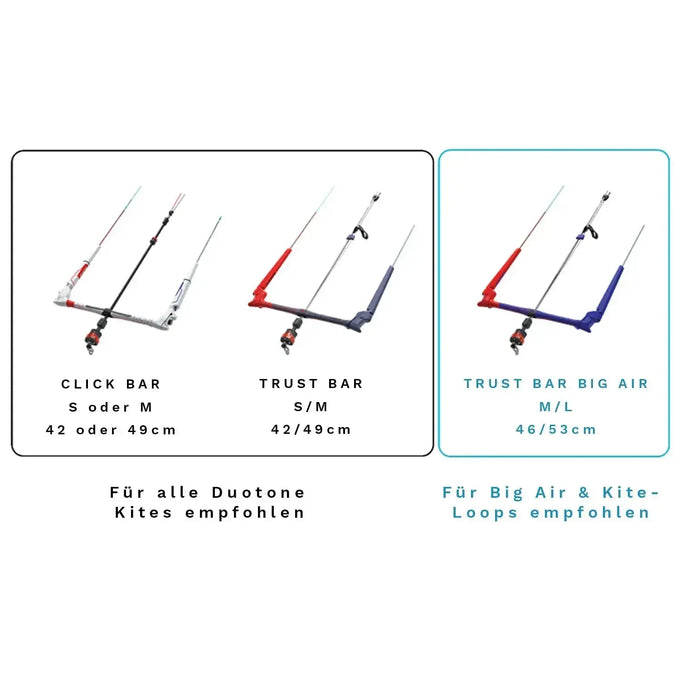 Durch die niedrige V-Position kann die Bar an fast alle anderen Kite-Modelle auf dem Markt angepasst werden. Bitte beachte, dass Duotone Kites am besten in der Werkseinstellung funktionieren!