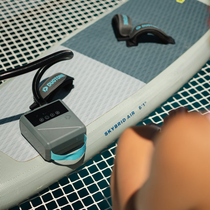 Schneller startklar, länger aufs Wasser! Die brandneue elektronische Luftpumpe "Lazepump" von Duotone liefert bahnbrechende Leistung für alle Wassersportfans. Dieser kompakte Kraftprotz pumpt deine Kites, Wings, SUPs und mehr effizient auf – kein mühsames manuelles Pumpen mehr, sondern maximale Zeit auf dem Wasser! Bereit, deine Pre-Session-Routine zu revolutionieren? Genau das liefert die Duotone Lazepump! Mit beeindruckender Leistung und breiter Kompatibilität mit allen aufblasbaren Produkten ist dieses Zubehör die perfekte Kombination aus Power, Präzision und Portabilität.