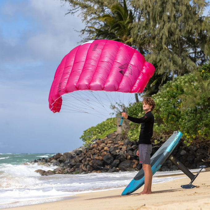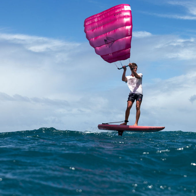 Erwarte nicht, dass Parawingen so einfach wie Wing Foilen ist! Das Balancieren auf deinem Board ist herausfordernder, ohne einen stabilen, aufgeblasenen Wing in der Hand zu haben, daher empfehlen wir, besonders bei deinen ersten Versuchen ein größeres Board zu verwenden.