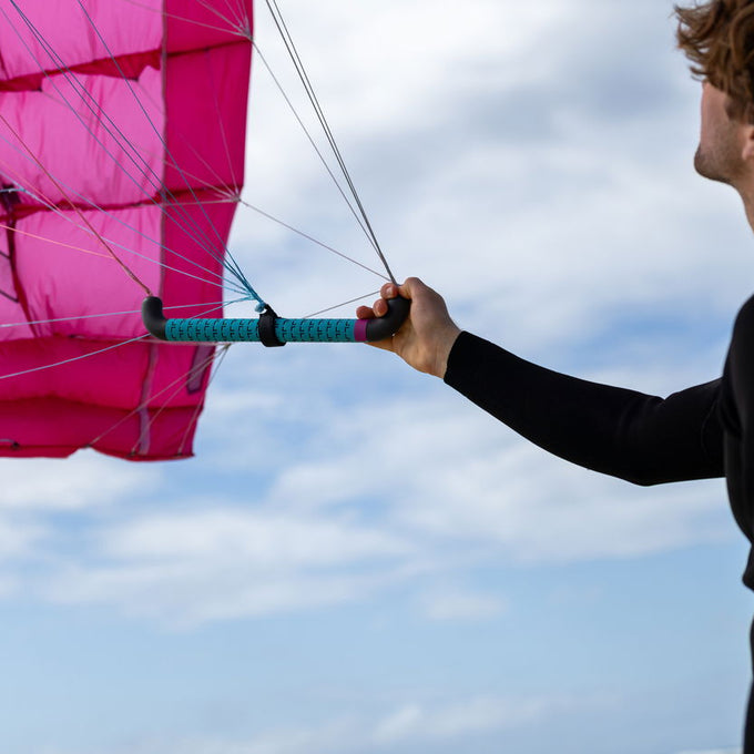 Die meisten Parawinger nutzen den Wing ohne Leash, um ein Verwickeln von Leinen und Bridle-Leinen zu vermeiden. Wenn du den Parawing loslässt, wird er eine Weile an der Wasseroberfläche treiben. Stelle sicher, dass du zu dem Wing paddelst, bevor er unter die Oberfläche taucht, wodurch es schwierig wird, ihn zu finden, da nur der Carbon-Griff schwimmt.