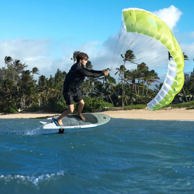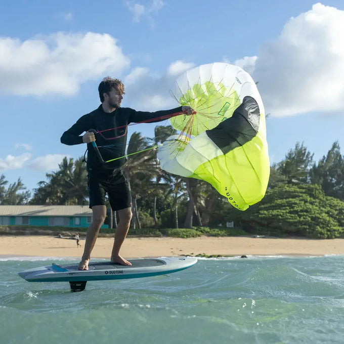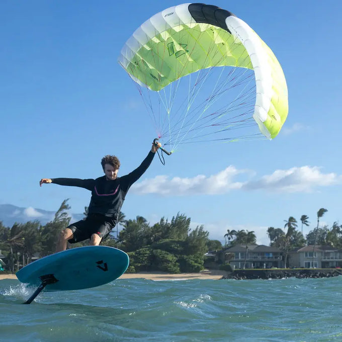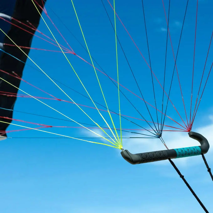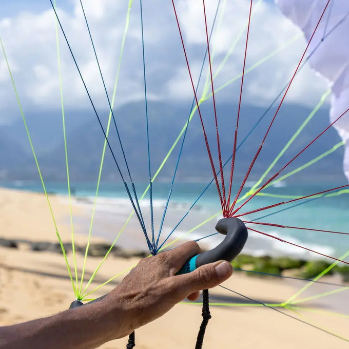 Die neue Handle ermöglicht es, die vordere Hand unter die A-Leinen zu schieben, was den Fahrkomfort und die Kraftverteilung immens verbessert. Die Leinen-Anbindungen sind in die Handle integriert, inklusive Trapeztampen – für ein sauberes, aufgeräumtes Setup, verwicklungsfreies Verstauen und einen schnellen Re-launch.