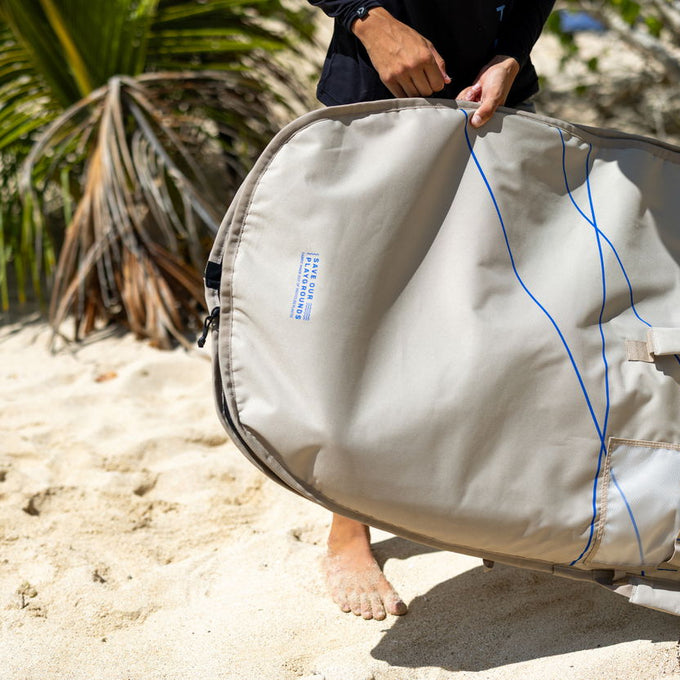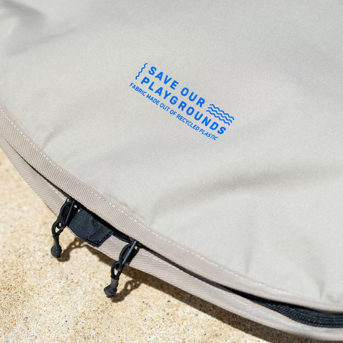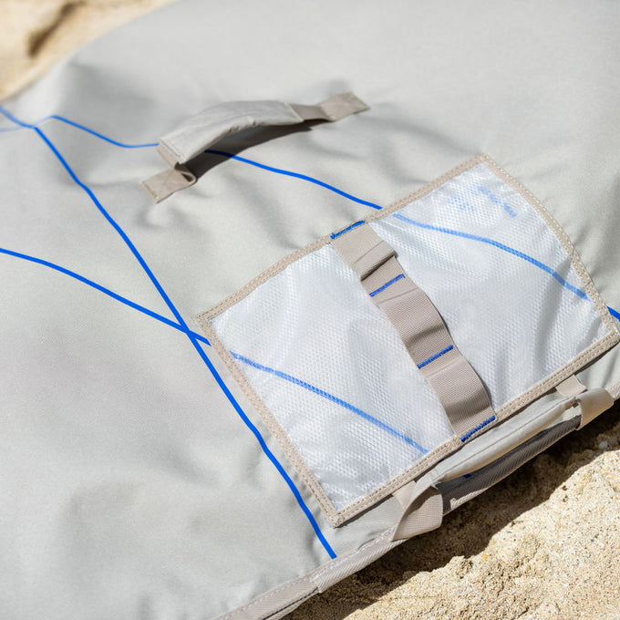 Gefertigt aus einer robusten Hülle aus 100 % recyceltem Material und ausgestattet mit 5 mm Polsterung, schützt die Tasche dein Board zuverlässig vor Dellen und Kratzern. Die weiß beschichtete PE-Unterseite reflektiert Hitze und sorgt für ein kühles Klima im Inneren. Der Mastschlitz ermöglicht es, den Mast am Board zu lassen. Mit mittigem Tragegriff und Schultergurt-Kompatibilität war das Transportieren deines Boards noch nie so einfach.