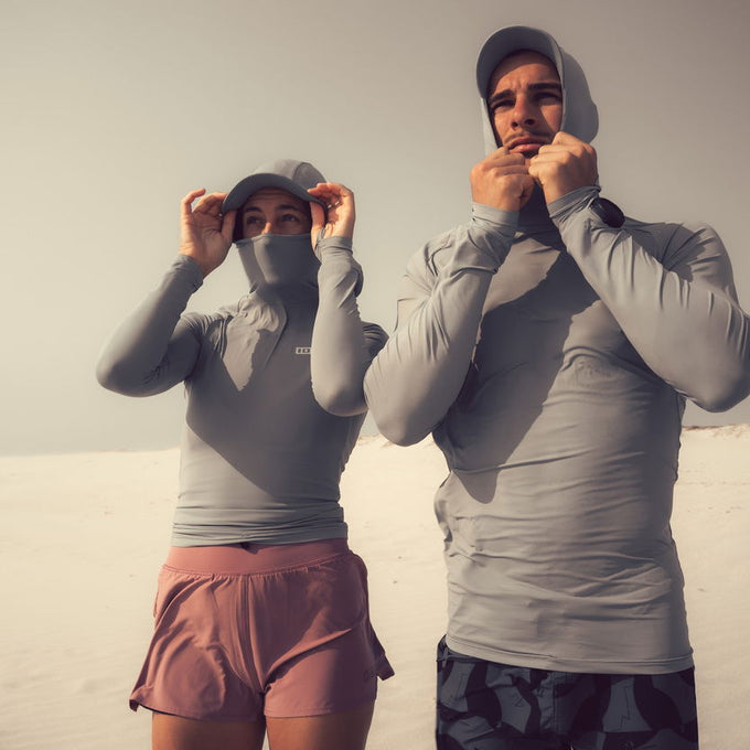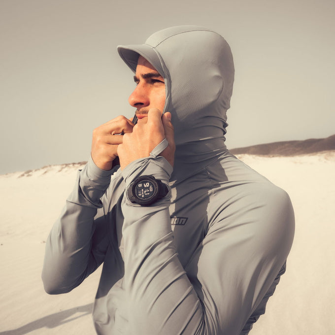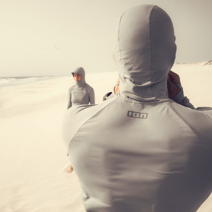Das enganliegende Lycra besteht recycelten Materialien und kommt mit 4Way‑Stretch für volle Bewegungsfreiheit. UPF 50+ schützt dich vor der Sonne, und der Kordelzug an der Haube ermöglicht die richtige Passform einzustellen.