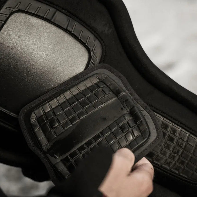 Das austauschbare Ergo_Pad auf der Trapezinnenseite bietet optimale Lendenwirbelunterstützung in zwei Profilen (mittlere und hohe Unterstützung). Für individuelle Rückenunterstützung & Verletzungsprophylaxe.