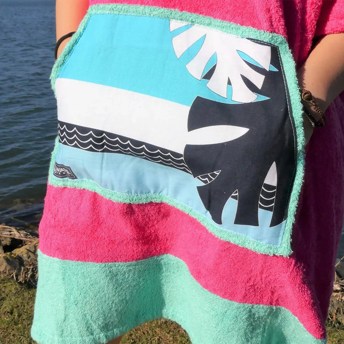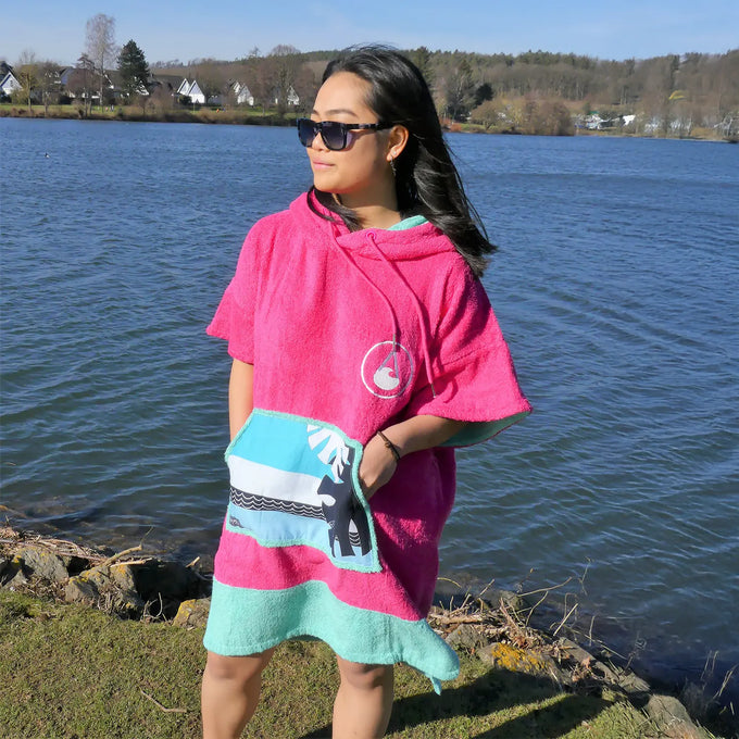 WAVE HAWAII Poncho Pink Wave, gemütlicher Poncho in Größe S aus super flauschigem Material mit 60% Viskose aus Bambusfaser und 40 % Baumwolle, die nach Öko Tex Standard 100 zertifiziert ist. Angenehm auf der Haut und gewohnt funktionell. Zweilagige, besonders warme Kapuze mit hohem Kragen, Kordel und Metallösen. Die große Fronttasche bietet Platz für Utensilien wie Shampoo oder Bürste oder auch deine kalten Hände. Ein echter Hingucker. Die sorgsam ausgesuchten Stoffe sind besonders flauschig und hautfreundlich. Nachhaltigkeit und Natürlichkeit in der Rohstoffauswahl spielt bei uns eine große Rolle – nicht nur deiner Haut zuliebe.